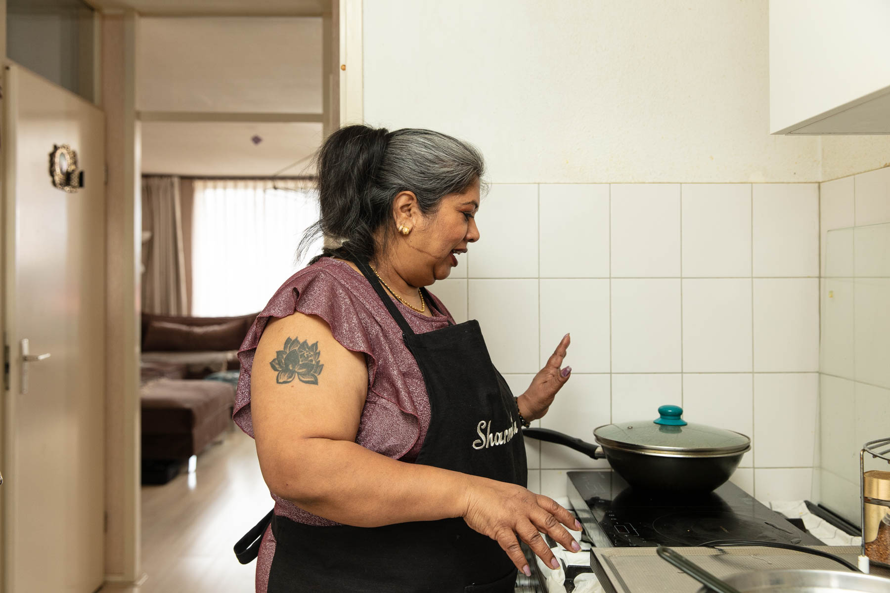 In de keuken en badkamer zet ze die lijn door. Sharmila kookt op inductie en maakt het liefst gebruik van een laag pitje. “Dat scheelt natuurlijk energie, en het eten wordt er alsnog erg lekker van.” Wassen doet ze het liefst in de ochtend, een droger heeft ze niet. “Ik hang alles gewoon op en laat het aan de lucht drogen.”