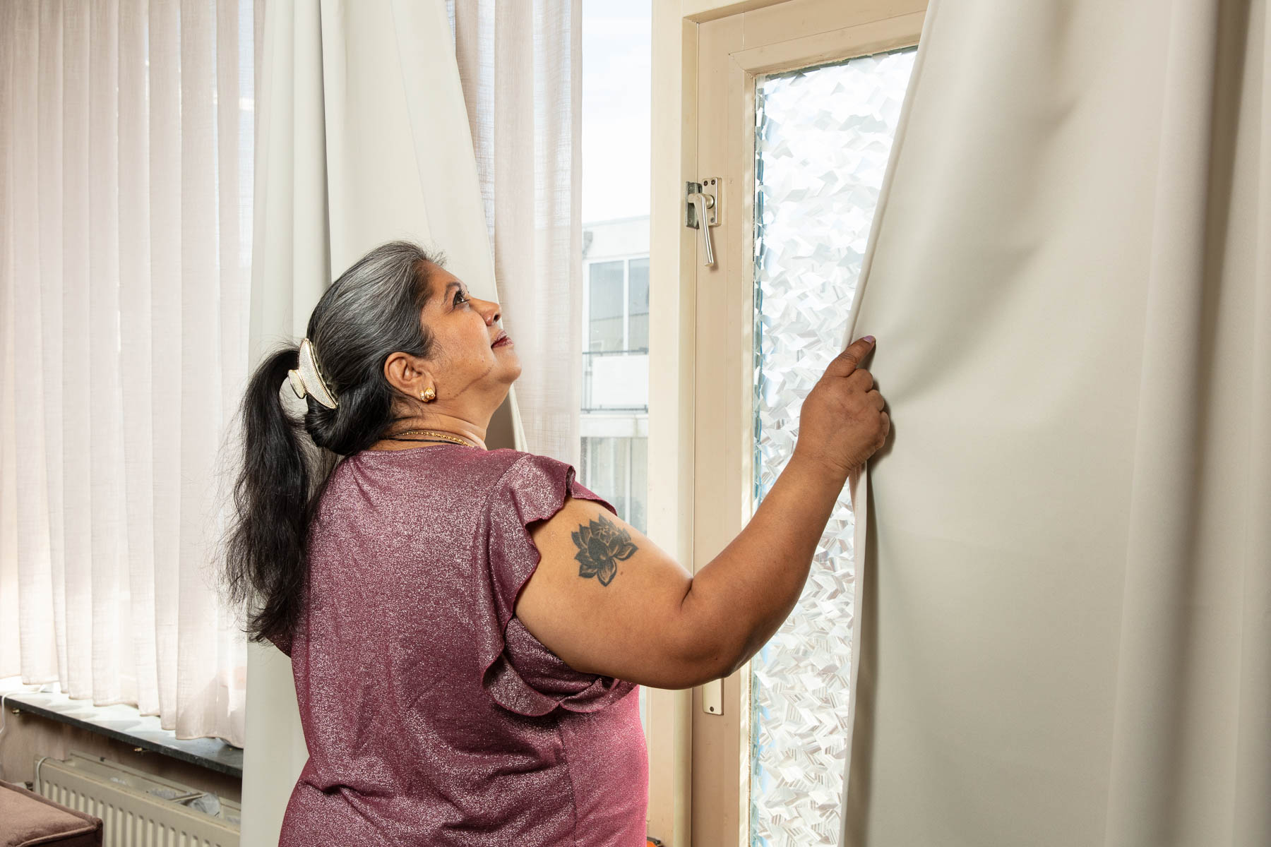 Ook met verwarming gaat ze doordacht om. Achter haar radiatoren heeft ze radiatorfolie geplakt en de gordijnen gebruikt ze bewust, afhankelijk van de stand van de zon. In de woonkamer hangen isolerende gordijn die ze in losse banen kan verschuiven. “Ik kijk gewoon waar de zon staat. In de zomer houd ik de zon buiten, in de winter laat ik de zon juist binnen.”